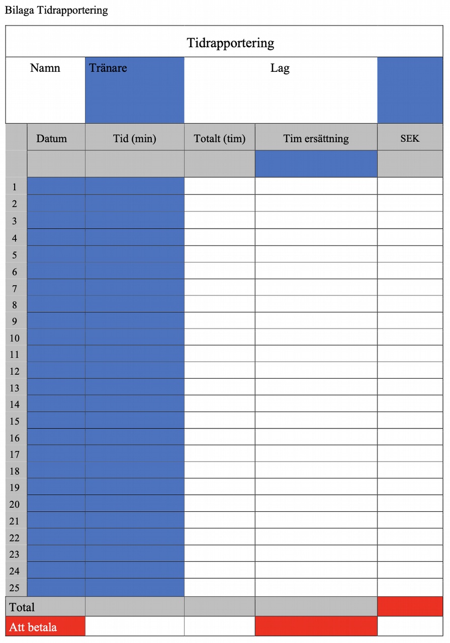 Tränaren redovisar sin tid som skall godkännas av lagledare/huvudtränare innan den skickas in till klubbchefen. Godkänd redovisning skall vara klubbkassören tillhanda senast den 15:e för utbetalning den 25:e i månaden. Därefter sker redovisning enligt Skatteverkets gällande regler. Föreningen drar i förekommande fall preliminärskatt och betalar in denna samt arbetsgivaravgifter.