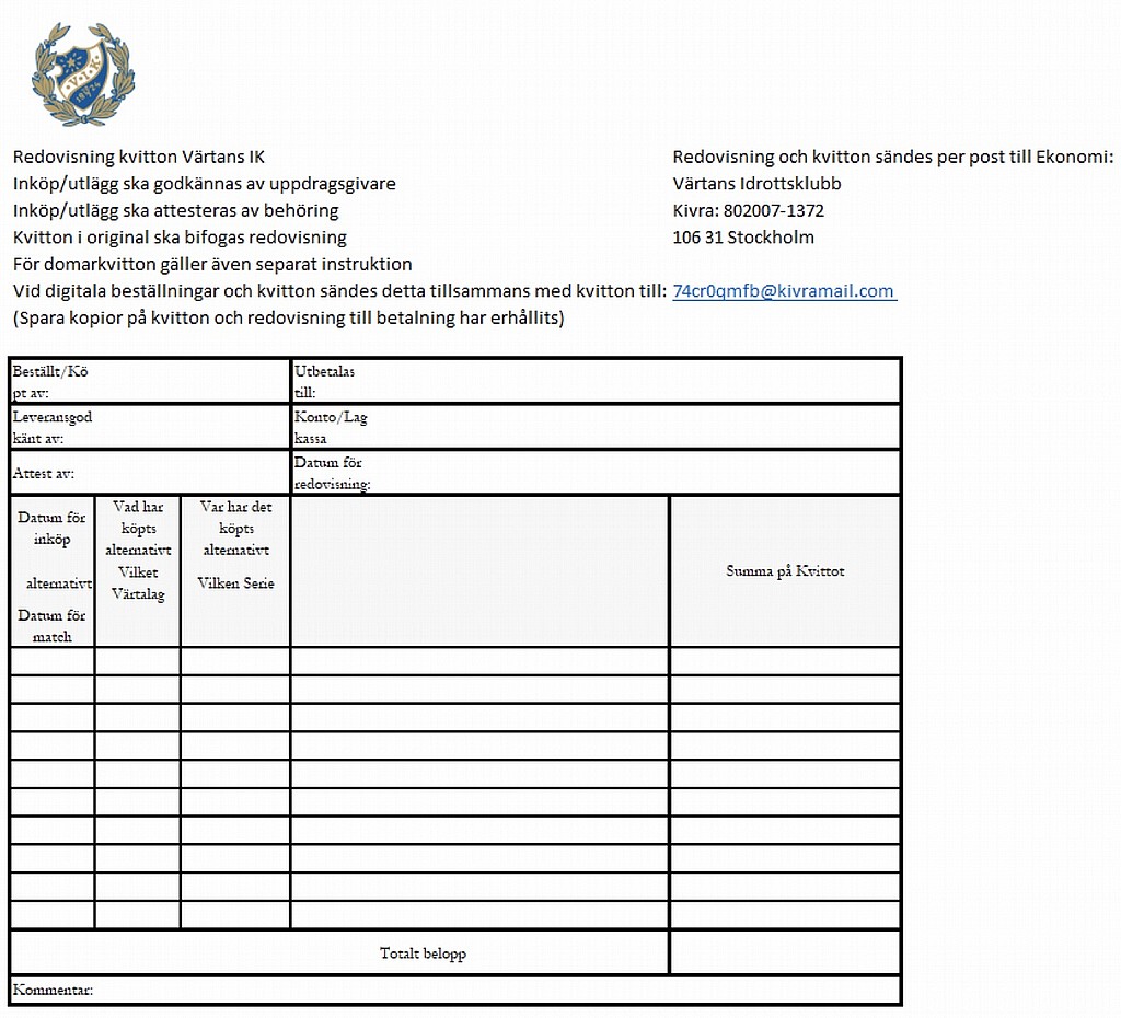 Denna instruktion gäller för all verksamhet inom Värtans IK och beskriver hur beställningar och inköp görs samt vem som attesterar. Här finns även beskrivet hur klubben hanterar utlägg som t.ex. domarkvitton, samt vilka funktioner som har vilka rättigheter.
